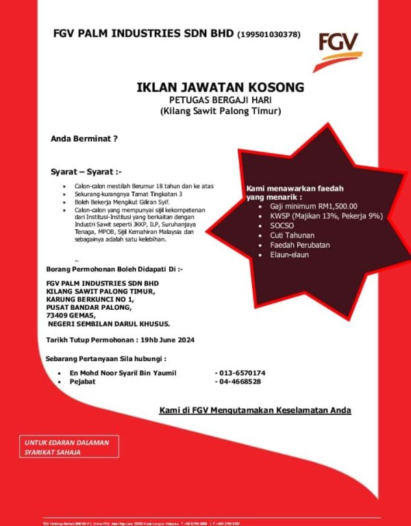 Iklan Kini Jawatan Kosong FGV Palm Industries Sdn Bhd Like serta Ikut Facebook Kami, follow Chanel WhatsApp Jawatan Kosong & Telegram Portal SPA9 untuk capaian pantas kekosongan jawatan daripada kami sekarang. Klik Jawatan Disini