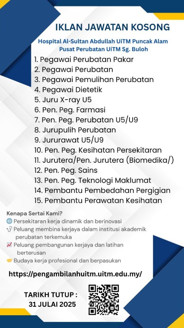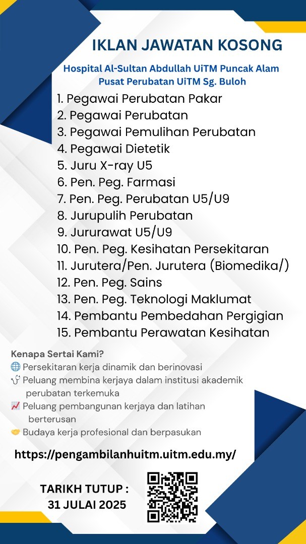 Iklan Kini Jawatan Kosong Hospital Al-Sultan Abdullah UiTM Like serta Ikut Facebook Kami, follow Chanel WhatsApp Jawatan Kosong & Telegram Portal SPA9 untuk capaian pantas kekosongan jawatan daripada kami sekarang.