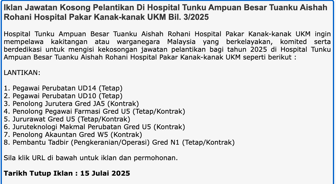 Iklan Kini Jawatan Kosong Hospital Tunku Ampuan Besar Tuanku Aishah Rohani, Hospital Pakar Kanak-Kanak UKM (HPKK)