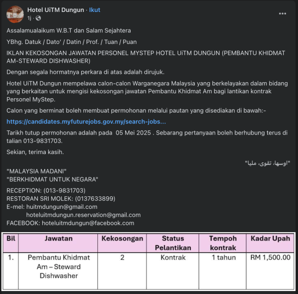 Iklan Kini Jawatan Kosong Hotel UiTM Like serta Ikut Facebook Kami, follow Chanel WhatsApp Jawatan Kosong & Telegram Portal SPA9 untuk capaian pantas kekosongan jawatan daripada kami sekarang. Klik Jawatan Disini