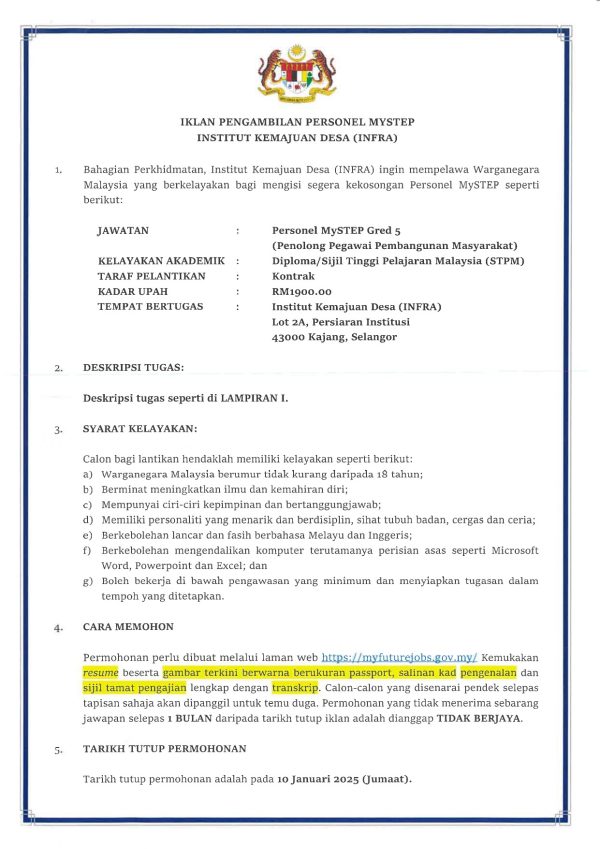 Iklan Kini Jawatan Kosong Institut Kemajuan Desa (INFRA) Klik Jawatan Disini Like serta Ikut Facebook Kami, follow Chanel WhatsApp Jawatan Kosong & Telegram Portal SPA9 untuk capaian pantas kekosongan jawatan daripada kami sekarang.