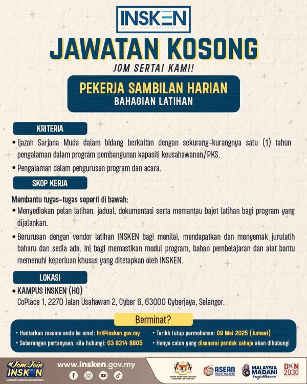 Iklan Kini Jawatan Kosong Institut Keusahawanan Negara (INSKEN) Like serta Ikut Facebook Kami, follow Chanel WhatsApp Jawatan Kosong & Telegram Portal SPA9 untuk capaian pantas kekosongan jawatan daripada kami sekarang.