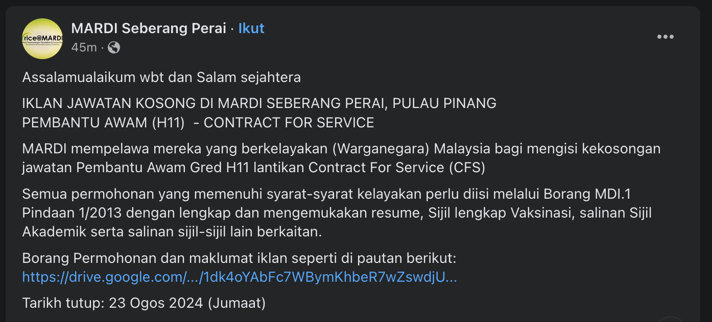 Iklan Kini Jawatan Kosong Institut Penyelidikan dan Kemajuan Pertanian Malaysia (MARDI) Like serta Ikut Facebook Kami, follow Chanel WhatsApp Jawatan Kosong & Telegram Portal SPA9 untuk capaian pantas kekosongan jawatan daripada kami sekarang. Klik Jawatan Disini