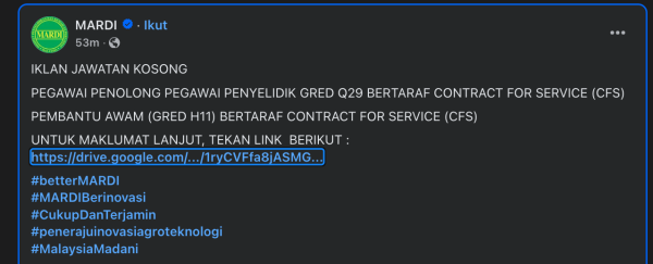 Iklan Kini Jawatan Kosong Institut Penyelidikan dan Kemajuan Pertanian Malaysia (MARDI) Like serta Ikut Facebook Kami, follow Chanel WhatsApp Jawatan Kosong & Telegram Portal SPA9 untuk capaian pantas kekosongan jawatan daripada kami sekarang. Klik Iklan Jawatan