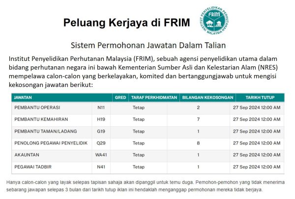 Iklan Kini Jawatan Kosong Institut Penyelidikan Perhutanan Malaysia (FRIM) Like serta Ikut Facebook Kami, follow Chanel WhatsApp Jawatan Kosong & Telegram Portal SPA9 untuk capaian pantas kekosongan jawatan daripada kami sekarang. Klik Jawatan Disini
