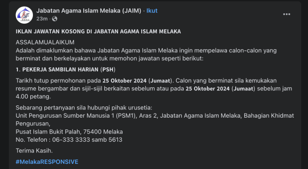 Iklan Kini Jawatan Kosong Jabatan Agama Islam Melaka (JAIM) Like serta Ikut Facebook Kami, follow Chanel WhatsApp Jawatan Kosong & Telegram Portal SPA9 untuk capaian pantas kekosongan jawatan daripada kami sekarang. Klik Jawatan Disini