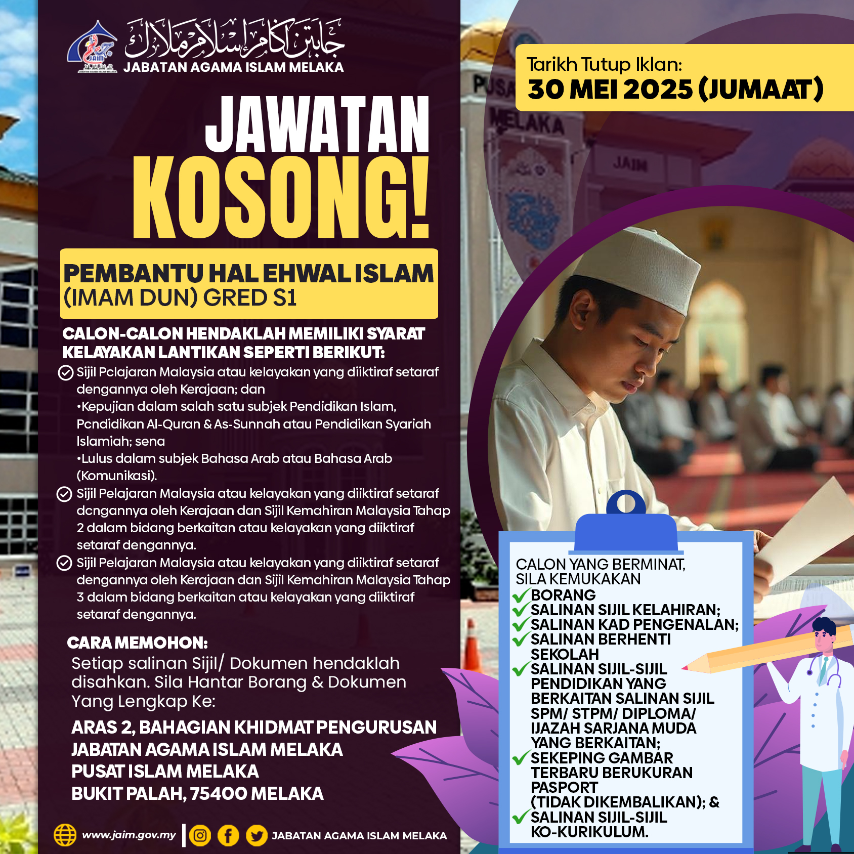 Iklan Kini Jawatan Kosong Jabatan Agama Islam Melaka (JAIM) Like serta Ikut Facebook Kami, follow Chanel WhatsApp Jawatan Kosong & Telegram Portal SPA9 untuk capaian pantas kekosongan jawatan daripada kami sekarang. Klik Jawatan Disini