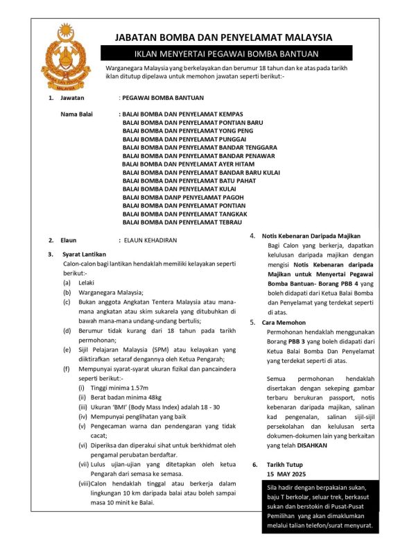 Iklan Kini Jawatan Kosong Jabatan Bomba Dan Penyelamat Malaysia (JBPM) Like serta Ikut Facebook Kami, follow Chanel WhatsApp Jawatan Kosong & Telegram Portal SPA9 untuk capaian pantas kekosongan jawatan daripada kami sekarang. Klik Jawatan Disini