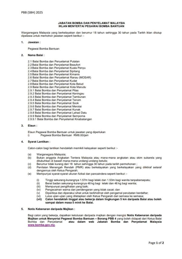 Iklan Kini Jawatan Kosong Jabatan Bomba Dan Penyelamat Malaysia ~ Pegawai Bomba Bantuan (PBB) Klik Jawatan Disini Like serta Ikut Facebook Kami, follow Chanel WhatsApp Jawatan Kosong & Telegram Portal SPA9 untuk capaian pantas kekosongan jawatan daripada kami sekarang.