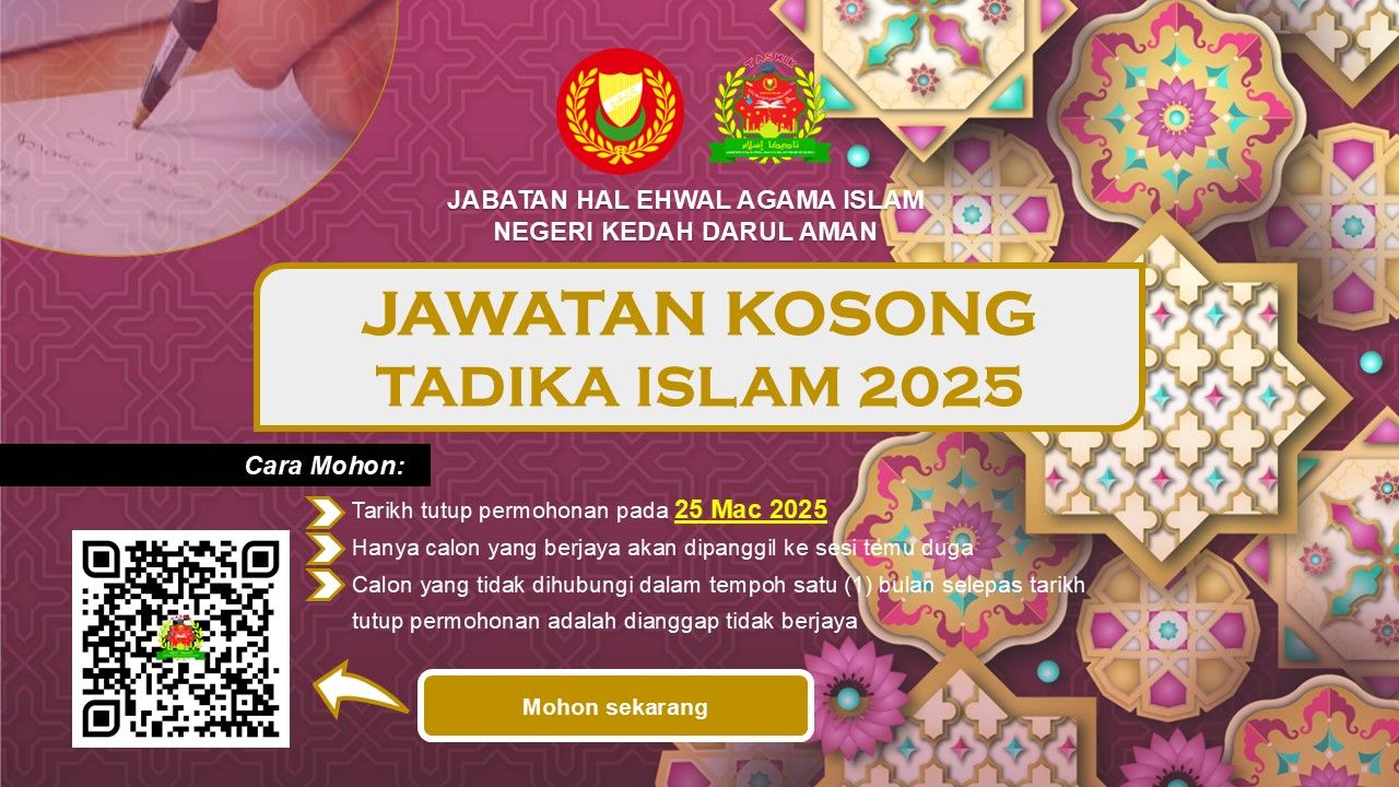 Iklan Kini Jawatan Kosong Jabatan Hal Ehwal Agama Islam Negeri Kedah Like serta Ikut Facebook Kami, follow Chanel WhatsApp Jawatan Kosong & Telegram Portal SPA9 untuk capaian pantas kekosongan jawatan daripada kami sekarang. Klik Jawatan Disini