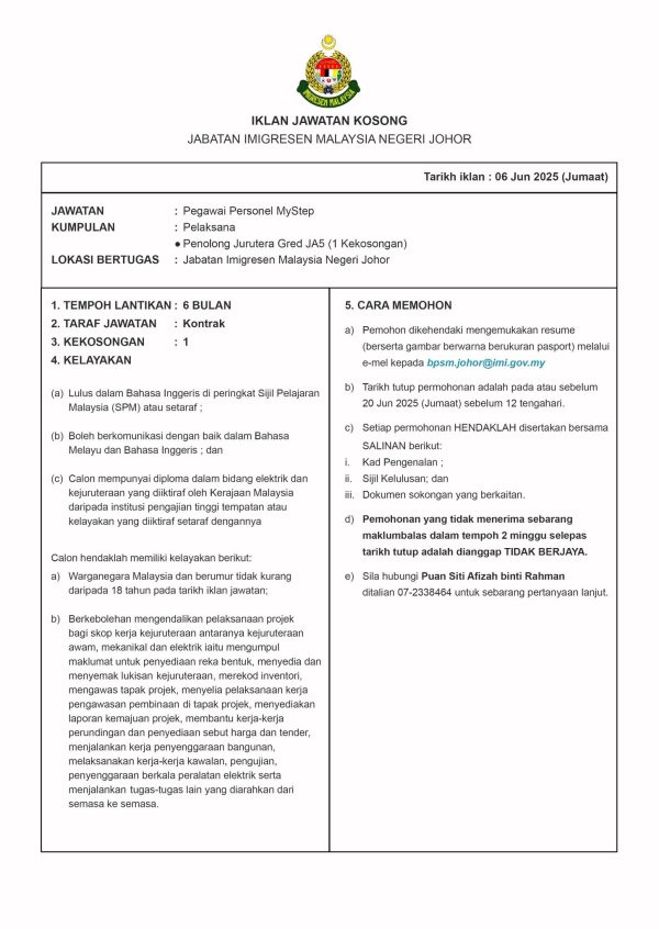Iklan Kini Jawatan Kosong Jabatan Imigresen Malaysia Klik Jawatan Disini Like serta Ikut Facebook Kami, follow Chanel WhatsApp Jawatan Kosong & Telegram Portal SPA9 untuk capaian pantas kekosongan jawatan daripada kami sekarang.