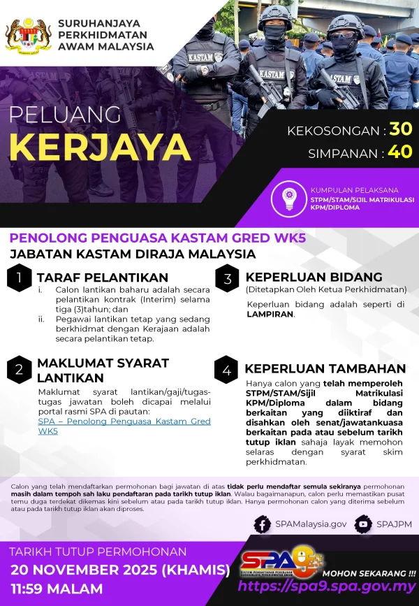 Iklan Kini Jawatan Kosong Jabatan Kastam Diraja Malaysia Like serta Ikut Facebook Kami, follow Chanel WhatsApp Jawatan Kosong & Telegram Portal SPA9 untuk capaian pantas kekosongan jawatan daripada kami sekarang. Klik Iklan Jawatan