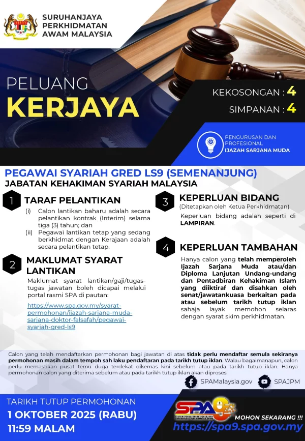 Iklan Kini Jawatan Kosong Jabatan Kehakiman Syariah Malaysia Like serta Ikut Facebook Kami, follow Chanel WhatsApp Jawatan Kosong & Telegram Portal SPA9 untuk capaian pantas kekosongan jawatan daripada kami sekarang. Klik Iklan Jawatan