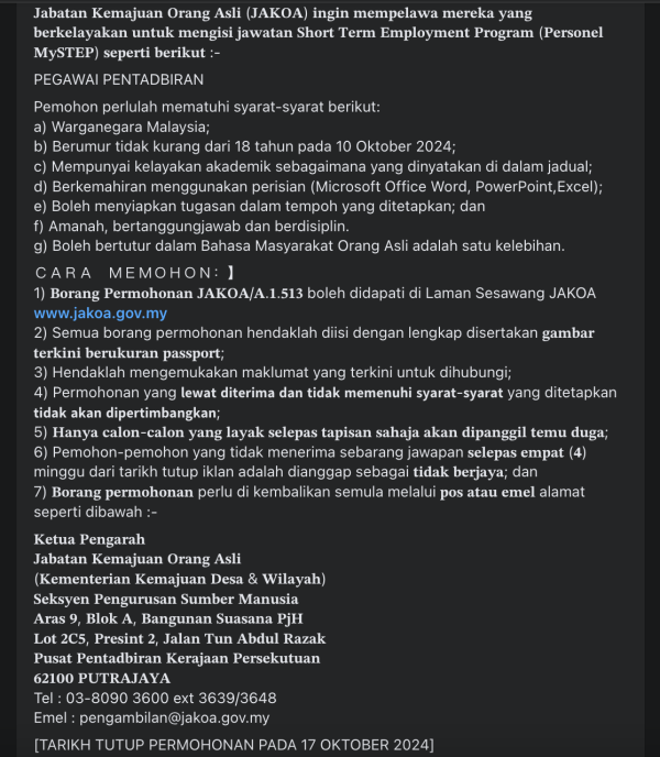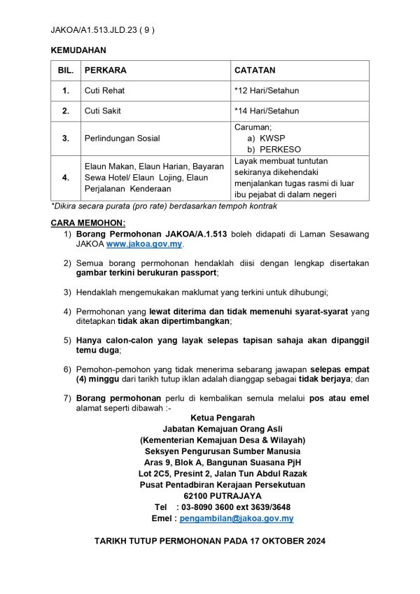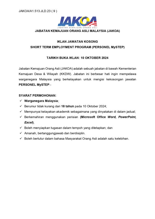 Iklan Kini Jawatan Kosong Jabatan Kemajuan Orang Asli (JAKOA) Like serta Ikut Facebook Kami, follow Chanel WhatsApp Jawatan Kosong & Telegram Portal SPA9 untuk capaian pantas kekosongan jawatan daripada kami sekarang. Klik Sini Jawatan Disini
