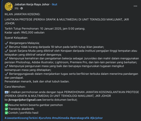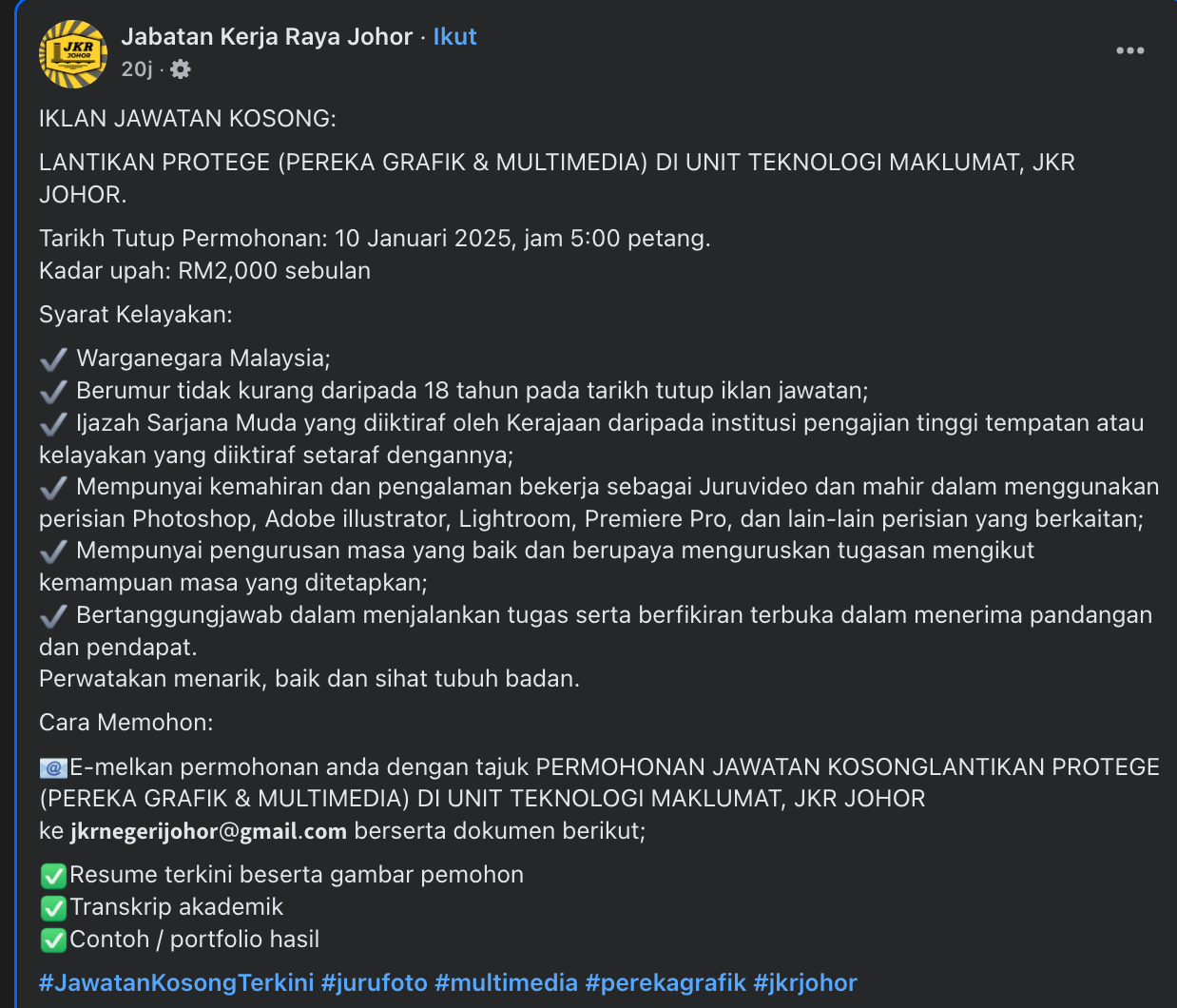 Iklan Kini Jawatan Kosong Jabatan Kerja Raya (JKR) Like serta Ikut Facebook Kami, follow Chanel WhatsApp Jawatan Kosong & Telegram Portal SPA9 untuk capaian pantas kekosongan jawatan daripada kami sekarang. Klik Iklan Jawatan