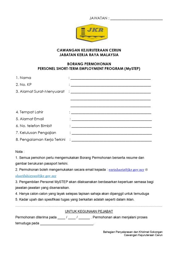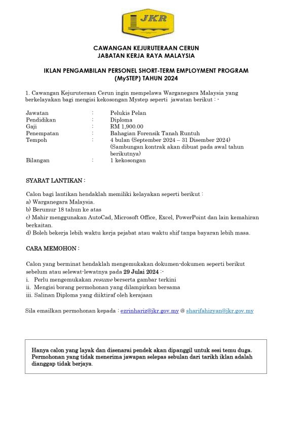 Iklan Kini Jawatan Kosong Jabatan Kerja Raya (JKR) Like serta Ikut Facebook Kami, follow Chanel WhatsApp Jawatan Kosong & Telegram Portal SPA9 untuk capaian pantas kekosongan jawatan daripada kami sekarang.