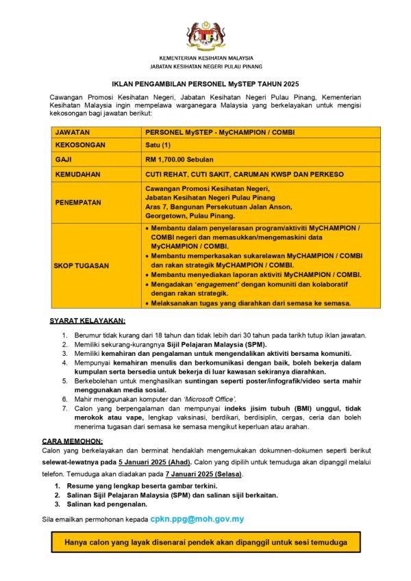 Iklan Kini Jawatan Kosong Jabatan Kesihatan Negeri Pulau Pinang