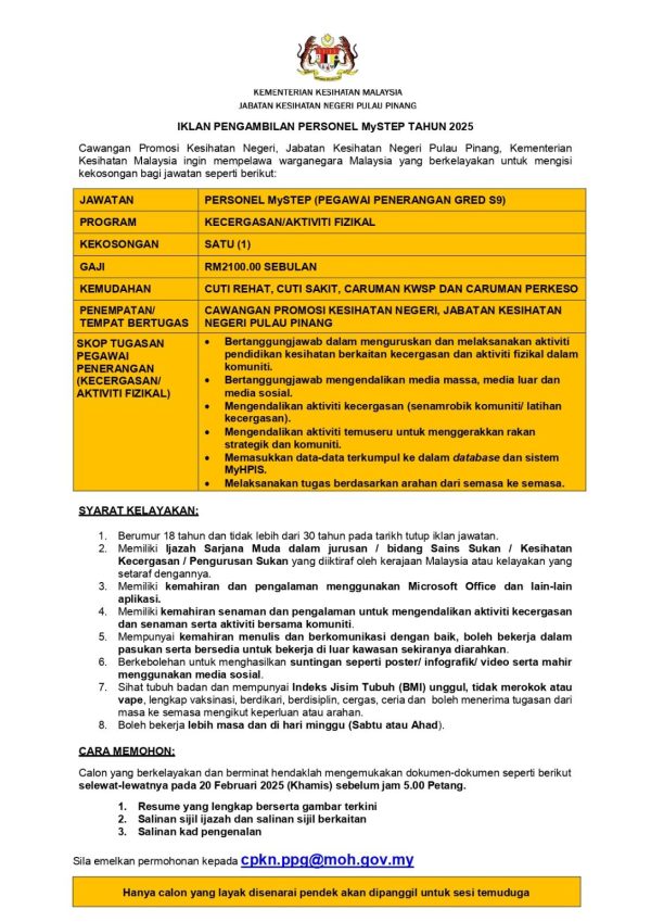 Iklan Kini Jawatan Kosong Jabatan Kesihatan Negeri Pulau Pinang Like serta Ikut Facebook Kami, follow Chanel WhatsApp Jawatan Kosong & Telegram Portal SPA9 untuk capaian pantas kekosongan jawatan daripada kami sekarang. Klik Iklan Jawatan