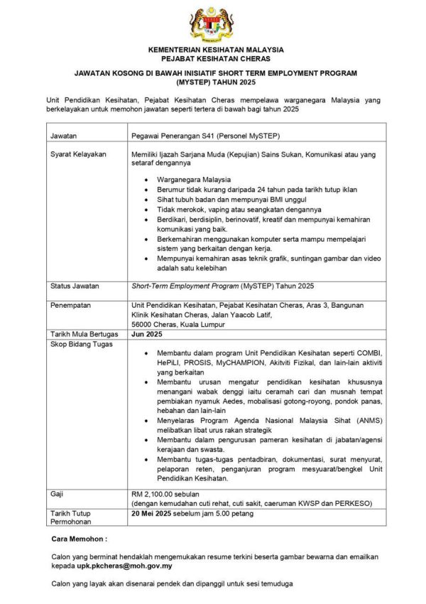 Iklan Kini Jawatan Kosong Jabatan Kesihatan WP Kuala Lumpur & Putrajaya Like serta Ikut Facebook Kami, follow Chanel WhatsApp Jawatan Kosong & Telegram Portal SPA9 untuk capaian pantas kekosongan jawatan daripada kami sekarang. Klik Jawatan Disini
