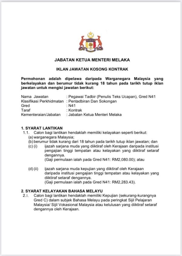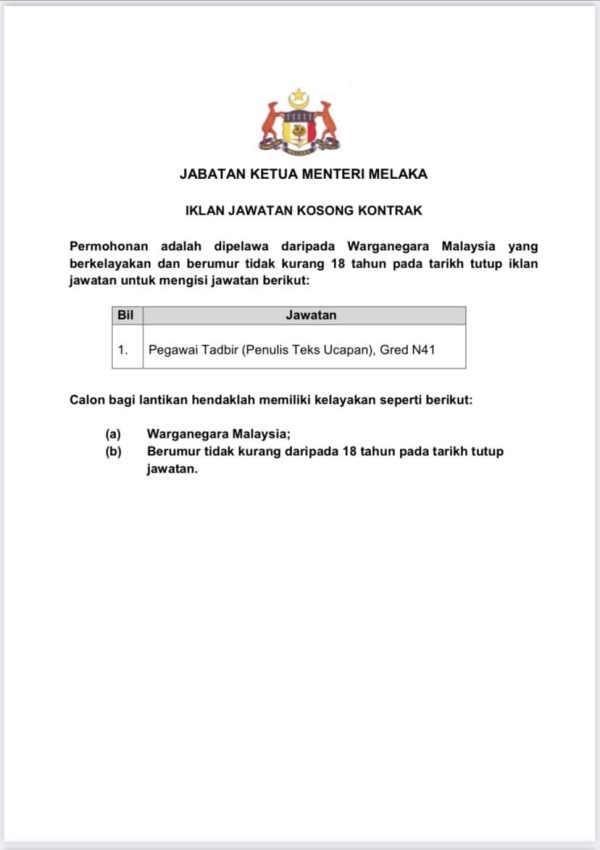 Iklan Kini Jawatan Kosong Jabatan Ketua Menteri Melaka Like serta Ikut Facebook Kami, follow Chanel WhatsApp Jawatan Kosong & Telegram Portal SPA9 untuk capaian pantas kekosongan jawatan daripada kami sekarang.