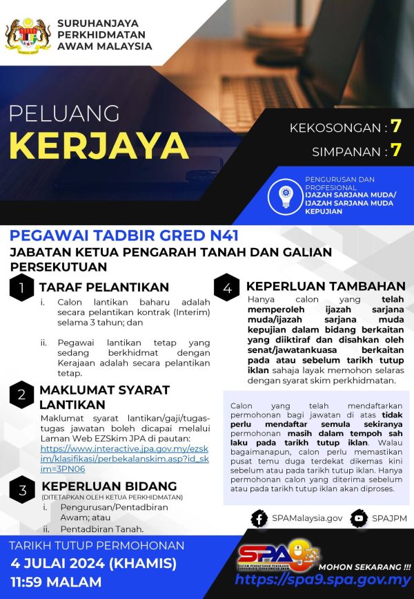 Iklan Kini Jawatan Kosong Jabatan Ketua Pengarah Tanah Dan Galian Persekutuan Like serta Ikut Facebook Kami, follow Chanel WhatsApp Jawatan Kosong & Telegram Portal SPA9 untuk capaian pantas kekosongan jawatan daripada kami sekarang. Klik Jawatan Disini