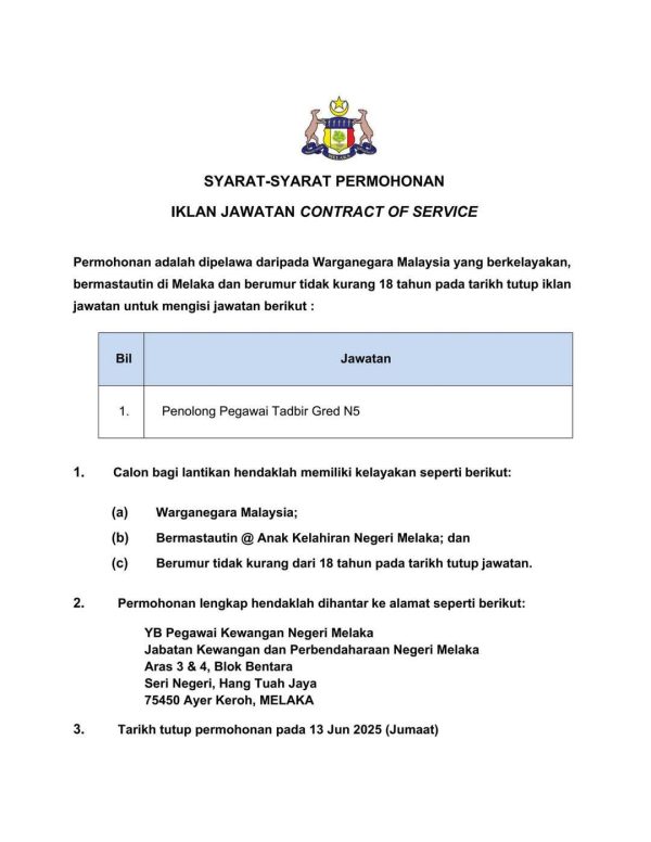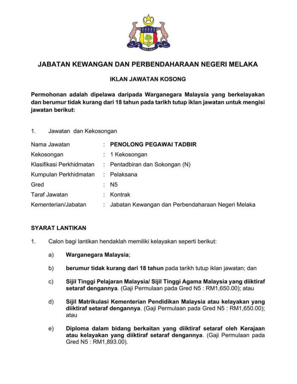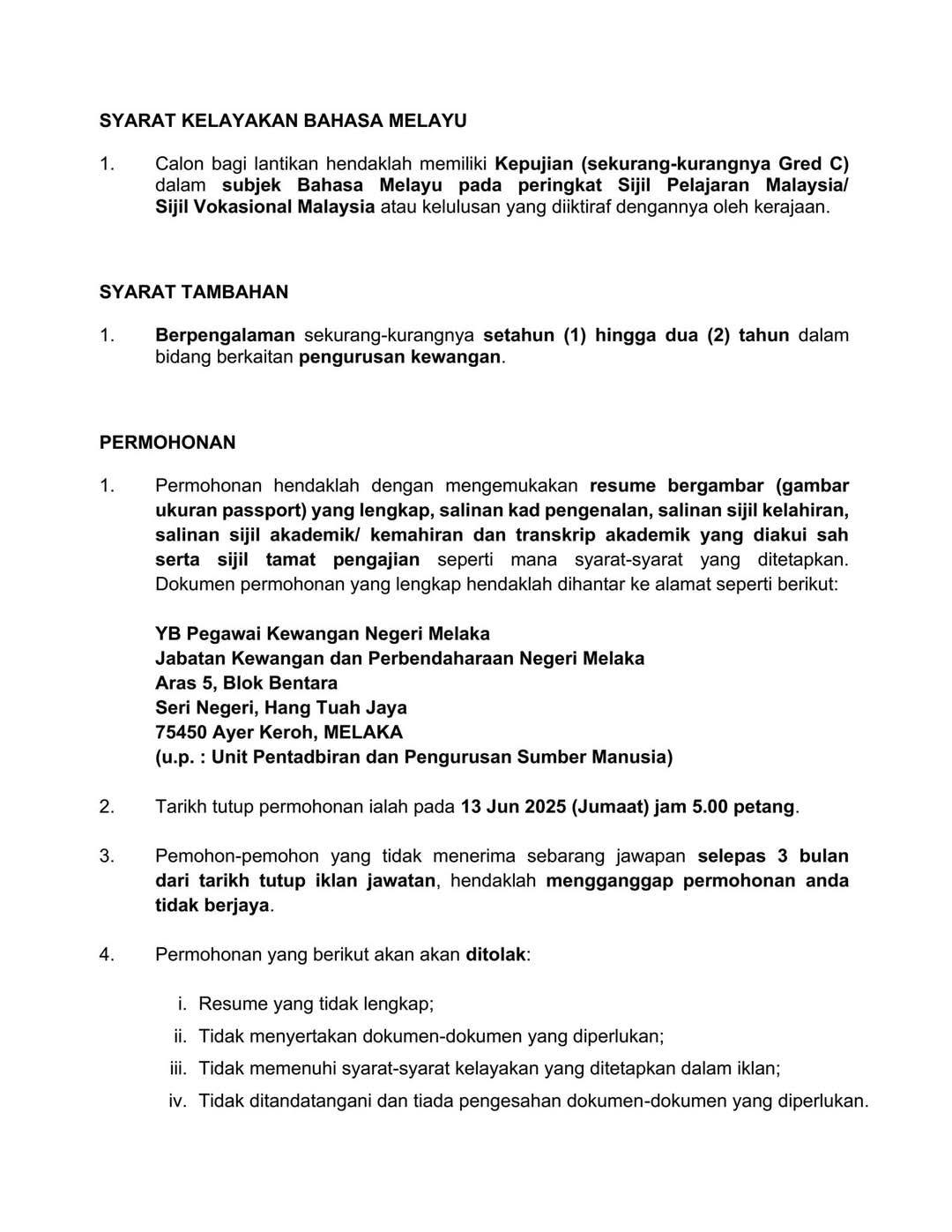 Iklan Kini Jawatan Kosong Jabatan Kewangan Dan Perbendaharaan Negeri Melaka Like serta Ikut Facebook Kami, follow Chanel WhatsApp Jawatan Kosong & Telegram Portal SPA9 untuk capaian pantas kekosongan jawatan daripada kami sekarang. Klik Jawatan Disini