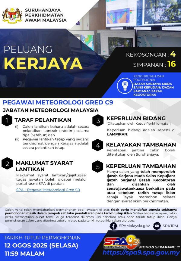 Iklan Kini Jawatan Kosong Jabatan Meteorologi Malaysia Like serta Ikut Facebook Kami, follow Chanel WhatsApp Jawatan Kosong & Telegram Portal SPA9 untuk capaian pantas kekosongan jawatan daripada kami sekarang. Klik Jawatan Disini