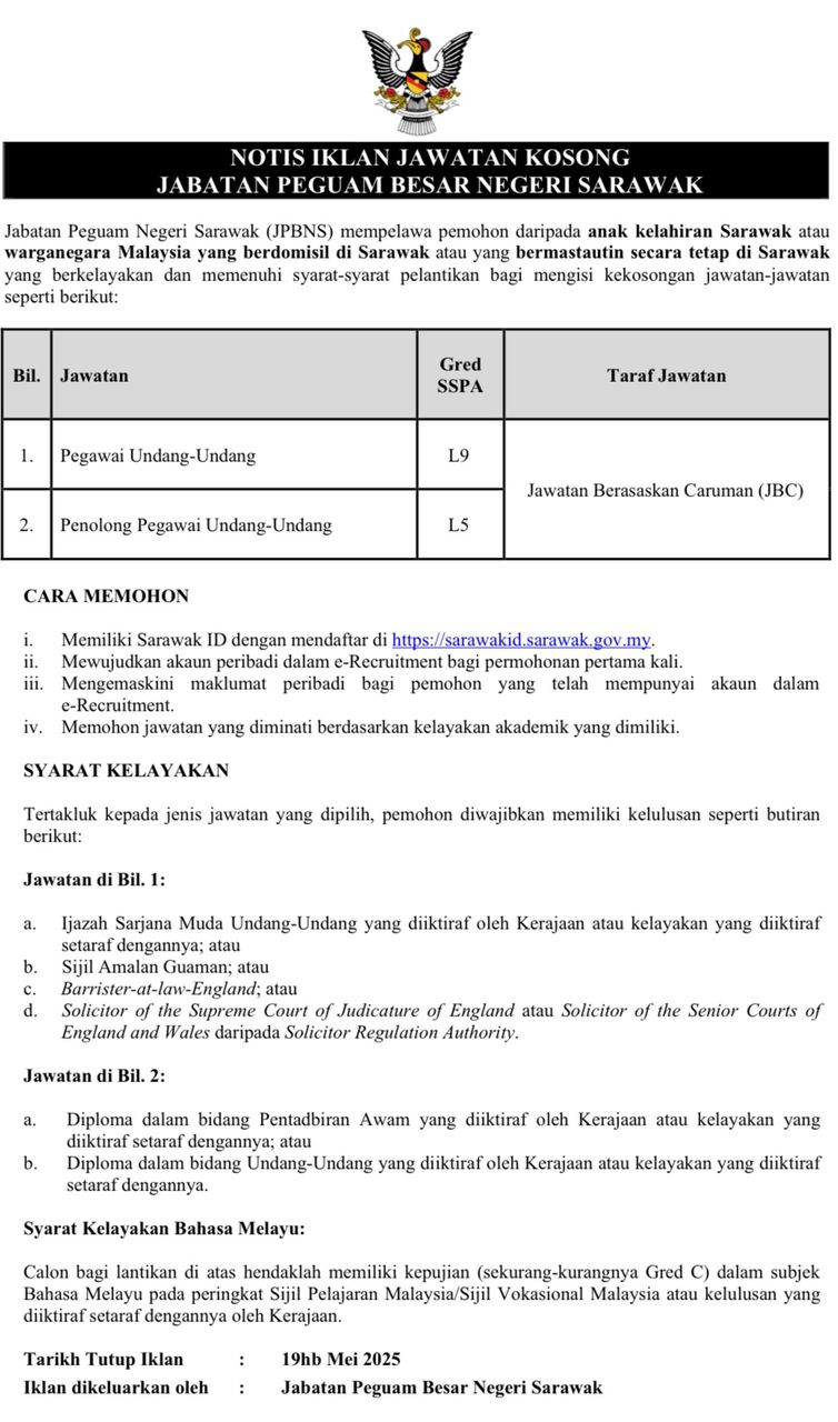 Iklan Kini Jawatan Kosong Jabatan Peguam Besar Negeri Sarawak Like serta Ikut Facebook Kami, follow Chanel WhatsApp Jawatan Kosong & Telegram Portal SPA9 untuk capaian pantas kekosongan jawatan daripada kami sekarang. Klik Jawatan Disini
