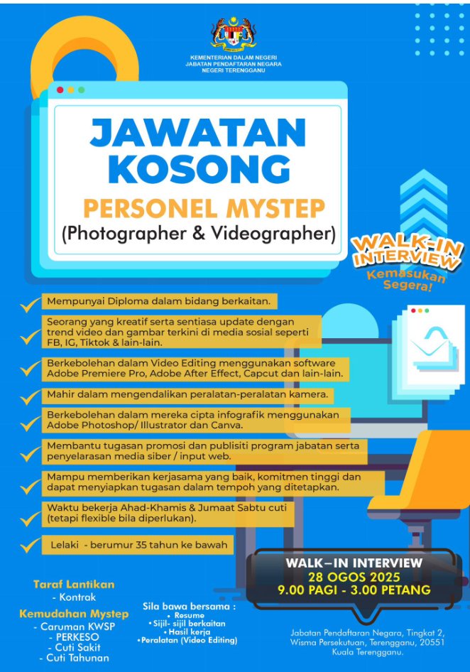 Iklan Kini Jawatan Kosong Jabatan Pendaftaran Negara (JPN) Like serta Ikut Facebook Kami, follow Chanel WhatsApp Jawatan Kosong & Telegram Portal SPA9 untuk capaian pantas kekosongan jawatan daripada kami sekarang.