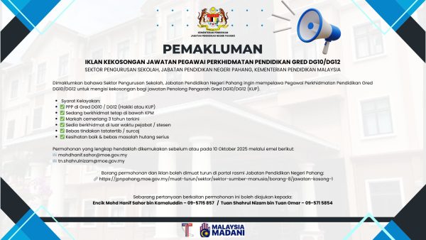 Iklan Kini Jawatan Kosong Jabatan Pendidikan Negeri Pahang Like serta Ikut Facebook Kami, follow Chanel WhatsApp Jawatan Kosong & Telegram Portal SPA9 untuk capaian pantas kekosongan jawatan daripada kami sekarang. Klik Iklan Jawatan