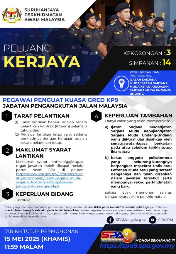 Iklan Kini Jawatan Kosong Jabatan Pengangkutan Jalan (JPJ) Iklan Jawatan Disini Like serta Ikut Facebook Kami, follow Chanel WhatsApp Jawatan Kosong & Telegram Portal SPA9 untuk capaian pantas kekosongan jawatan daripada kami sekarang.