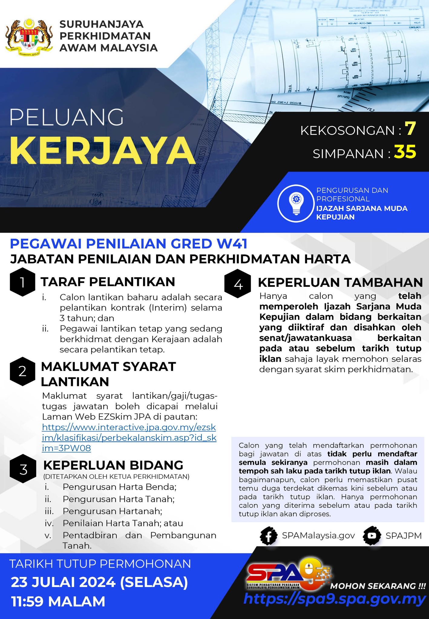 Iklan Kini Jawatan Kosong Jabatan Penilaian Dan Perkhidmatan Harta Like serta Ikut Facebook Kami, follow Chanel WhatsApp Jawatan Kosong & Telegram Portal SPA9 untuk capaian pantas kekosongan jawatan daripada kami sekarang. Klik Jawatan Disini