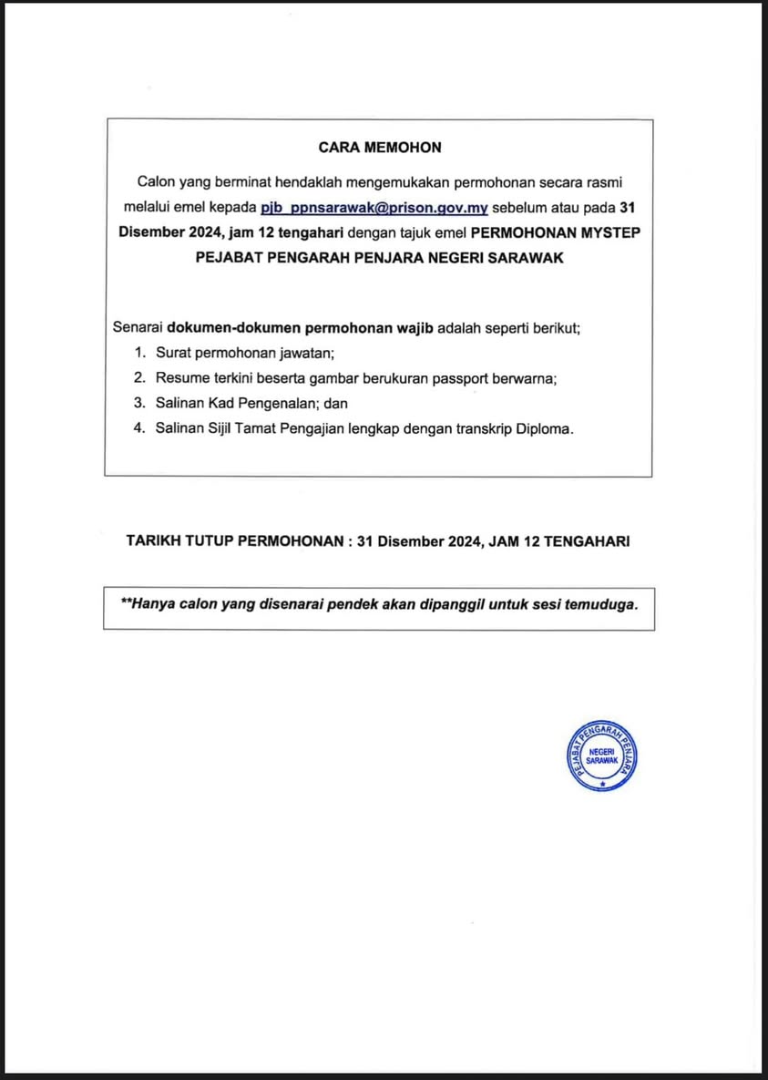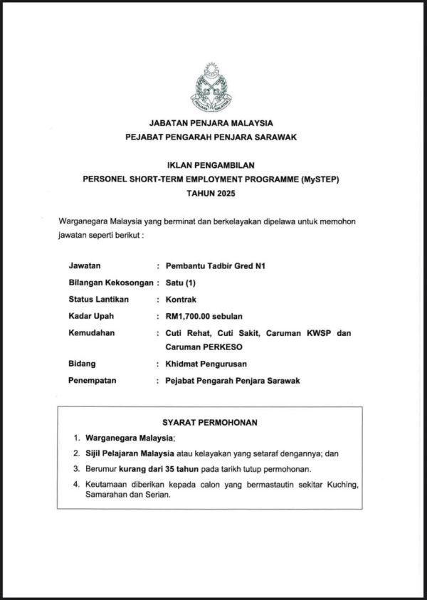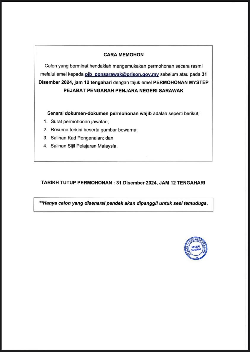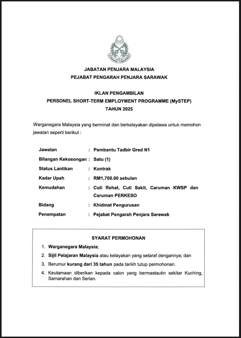 Iklan Kini Jawatan Kosong Jabatan Penjara Malaysia Klik Iklan Jawatan Like serta Ikut Facebook Kami, follow Chanel WhatsApp Jawatan Kosong & Telegram Portal SPA9 untuk capaian pantas kekosongan jawatan daripada kami sekarang.
