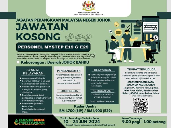Jabatan Perangkaan Malaysia Negeri Johor kini membuka peluang kepada individu yang berkelayakan untuk mengisi kekosongan jawatan Personel MySTEP Gred 19/29. Ini adalah peluang yang hebat untuk mereka yang mencari kerjaya dalam bidang statistik dan pertanian.