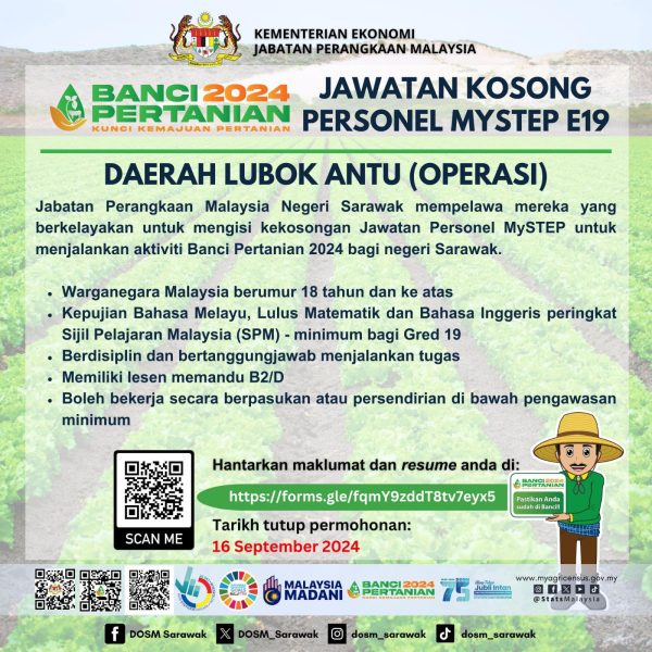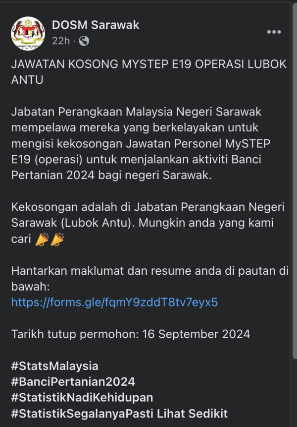 IKlan Kini Jawatan Kosong Jabatan Perangkaan Malaysia Negeri Sarawak Like serta Ikut Facebook Kami, follow Chanel WhatsApp Jawatan Kosong & Telegram Portal SPA9 untuk capaian pantas kekosongan jawatan daripada kami sekarang.