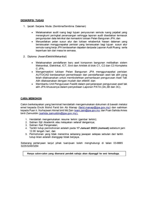 Iklan Kini Jawatan Kosong Jabatan Perkhidmatan Awam Malaysia (JPA) Klik Iklan Jawatan Like serta Ikut Facebook Kami, follow Chanel WhatsApp Jawatan Kosong & Telegram Portal SPA9 untuk capaian pantas kekosongan jawatan daripada kami sekarang.
