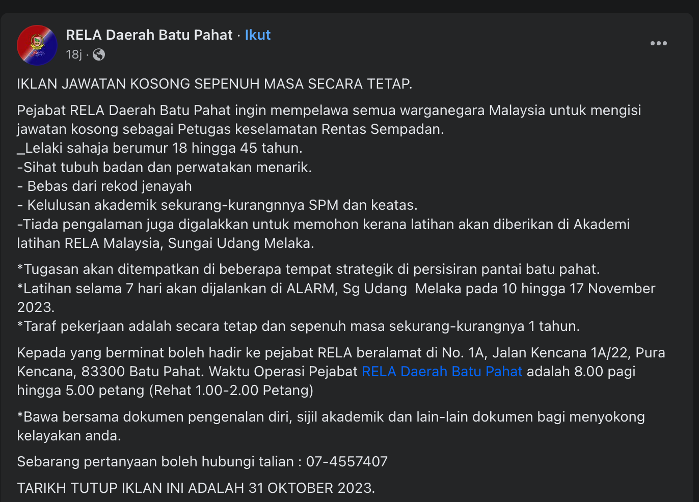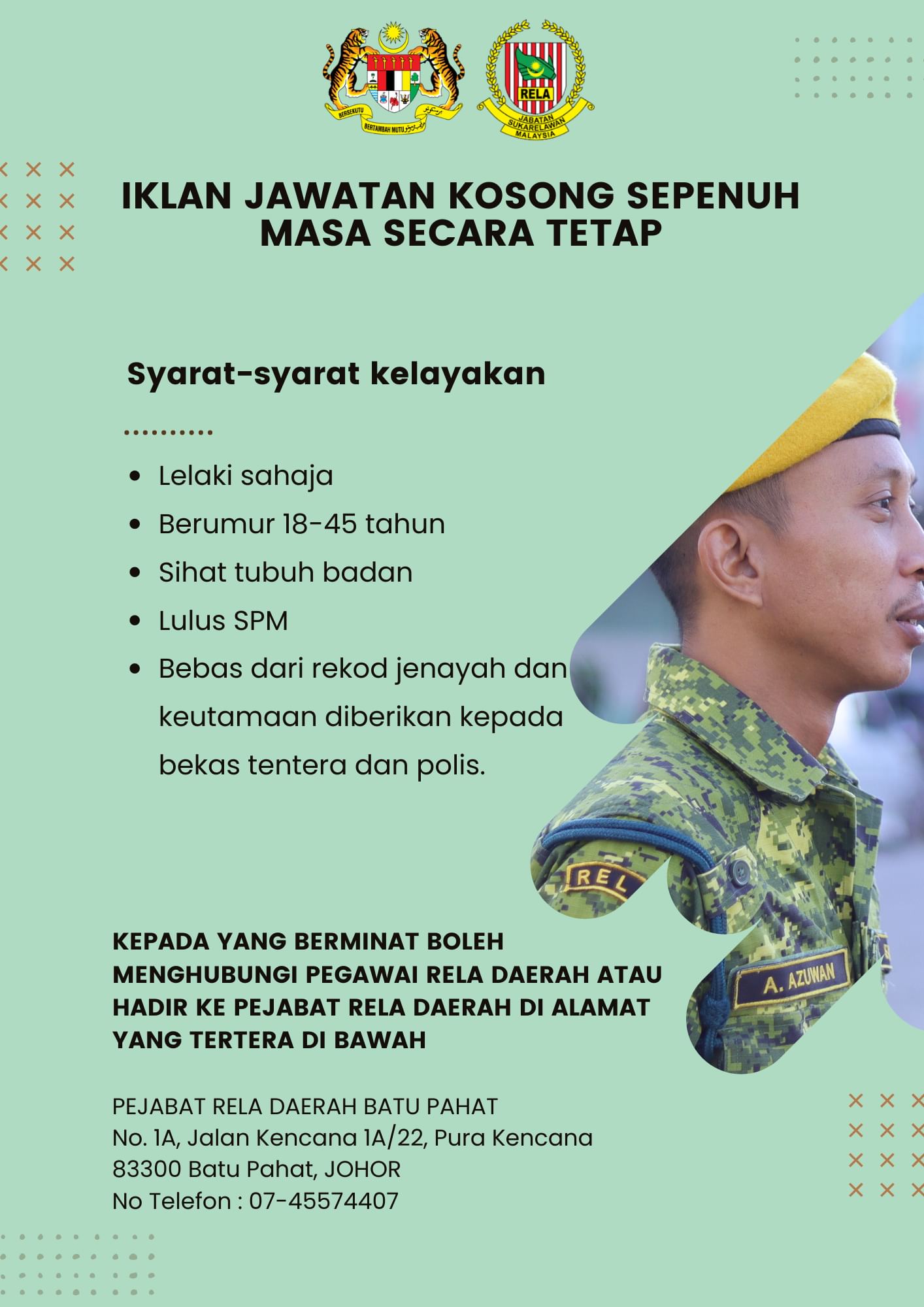 Iklan Kini Jawatan Kosong Jabatan Sukarelawan Malaysia (RELA) Like serta Ikut Facebook Kami, follow Chanel WhatsApp Jawatan Kosong & Telegram Portal SPA9 untuk capaian pantas kekosongan jawatan daripada kami sekarang.