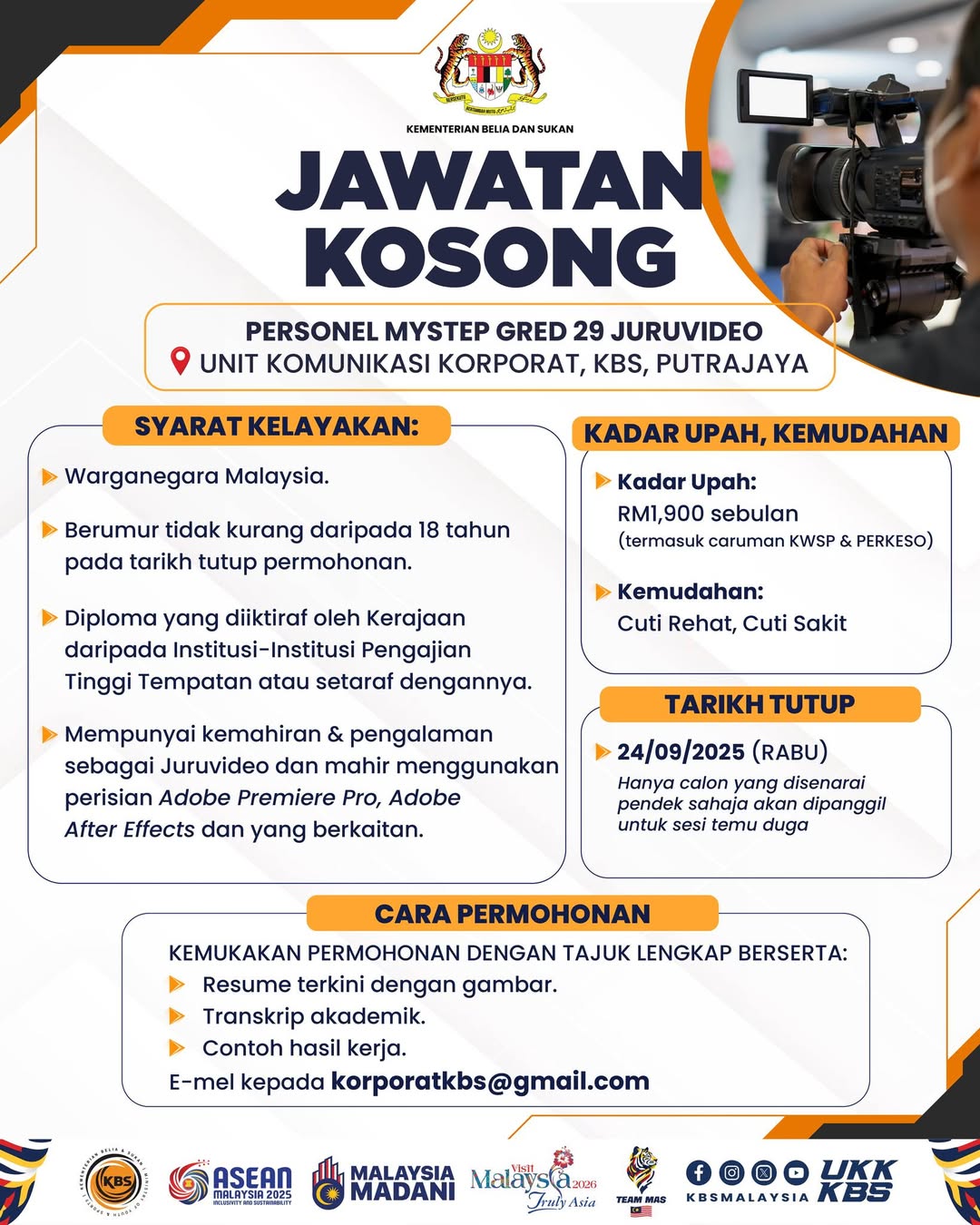 Iklan Kini Jawatan Kosong Kementerian Belia dan Sukan (KBS) Like serta Ikut Facebook Kami, follow Chanel WhatsApp Jawatan Kosong & Telegram Portal SPA9 untuk capaian pantas kekosongan jawatan daripada kami sekarang. Klik Iklan Disini
