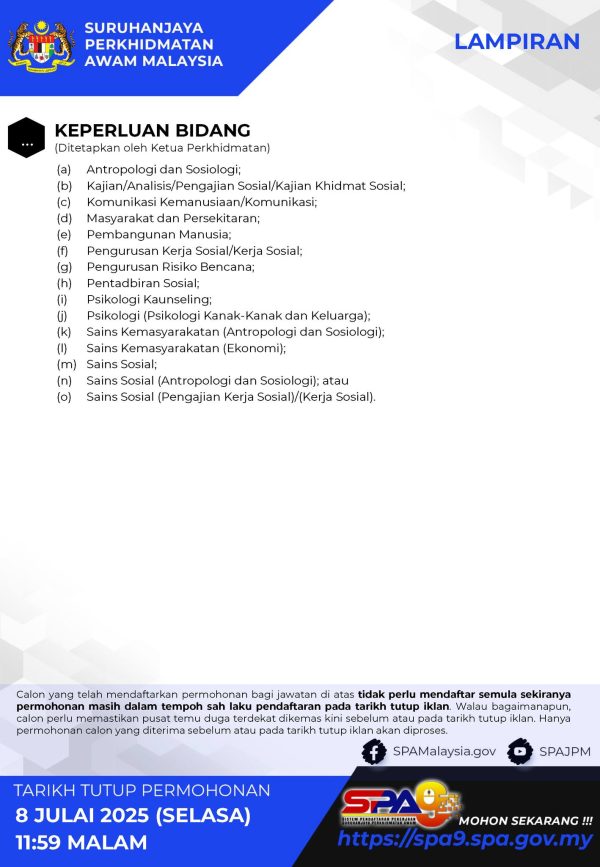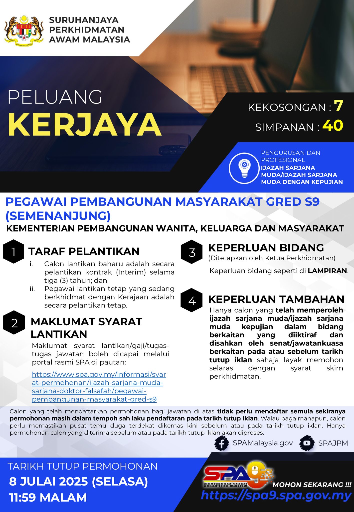 Iklan Kini Jawatan Kosong Kementerian Pembangunan Wanita, Keluarga Dan Masyarakat (KPWKM) Like serta Ikut Facebook Kami, follow Chanel WhatsApp Jawatan Kosong & Telegram Portal SPA9 untuk capaian pantas kekosongan jawatan daripada kami sekarang. Klik Jawatan Disini