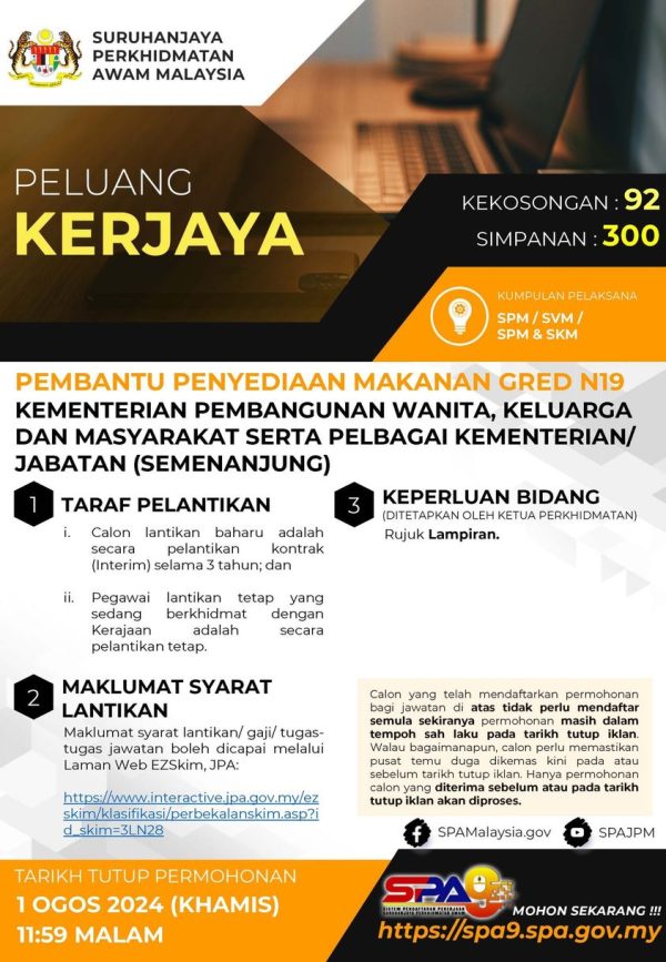 Iklan Kini Jawatan Kosong Kementerian Pembangunan Wanita, Keluarga Dan Masyarakat Like serta Ikut Facebook Kami, follow Chanel WhatsApp Jawatan Kosong & Telegram Portal SPA9 untuk capaian pantas kekosongan jawatan daripada kami sekarang. Klik Jawatan Disini