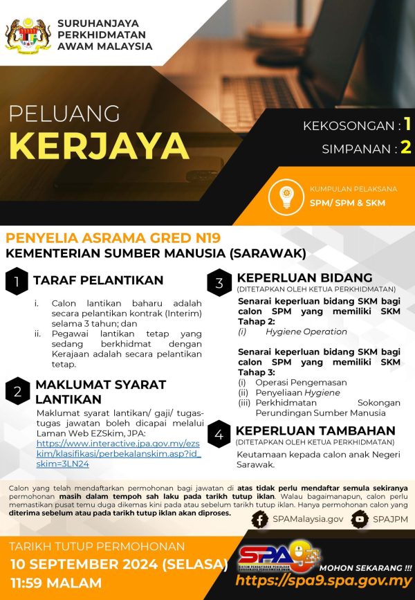 Iklan Kini Jawatan Kosong Kementerian Sumber Manusia Like serta Ikut Facebook Kami, follow Chanel WhatsApp Jawatan Kosong & Telegram Portal SPA9 untuk capaian pantas kekosongan jawatan daripada kami sekarang. Klik Jawatan Disini