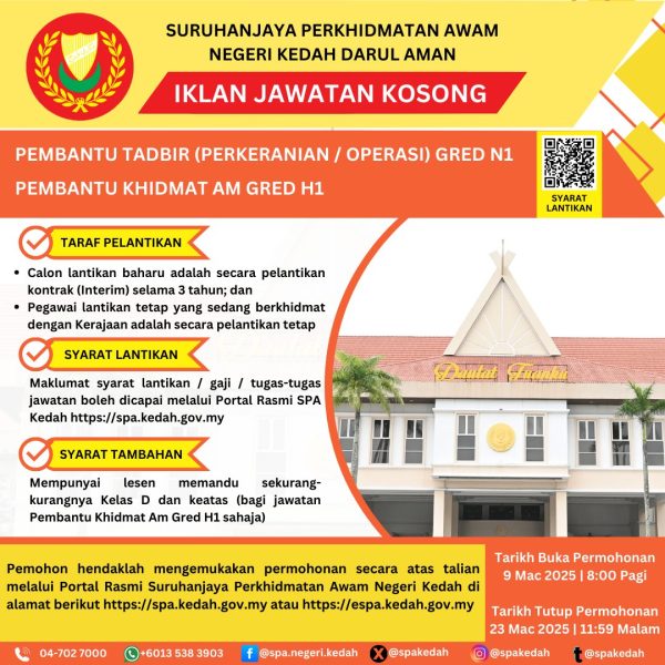 Iklan Kini Jawatan Kosong Kerajaan Negeri Kedah Darul Aman Klik Jawatan Disini Like serta Ikut Facebook Kami, follow Chanel WhatsApp Jawatan Kosong & Telegram Portal SPA9 untuk capaian pantas kekosongan jawatan daripada kami sekarang.