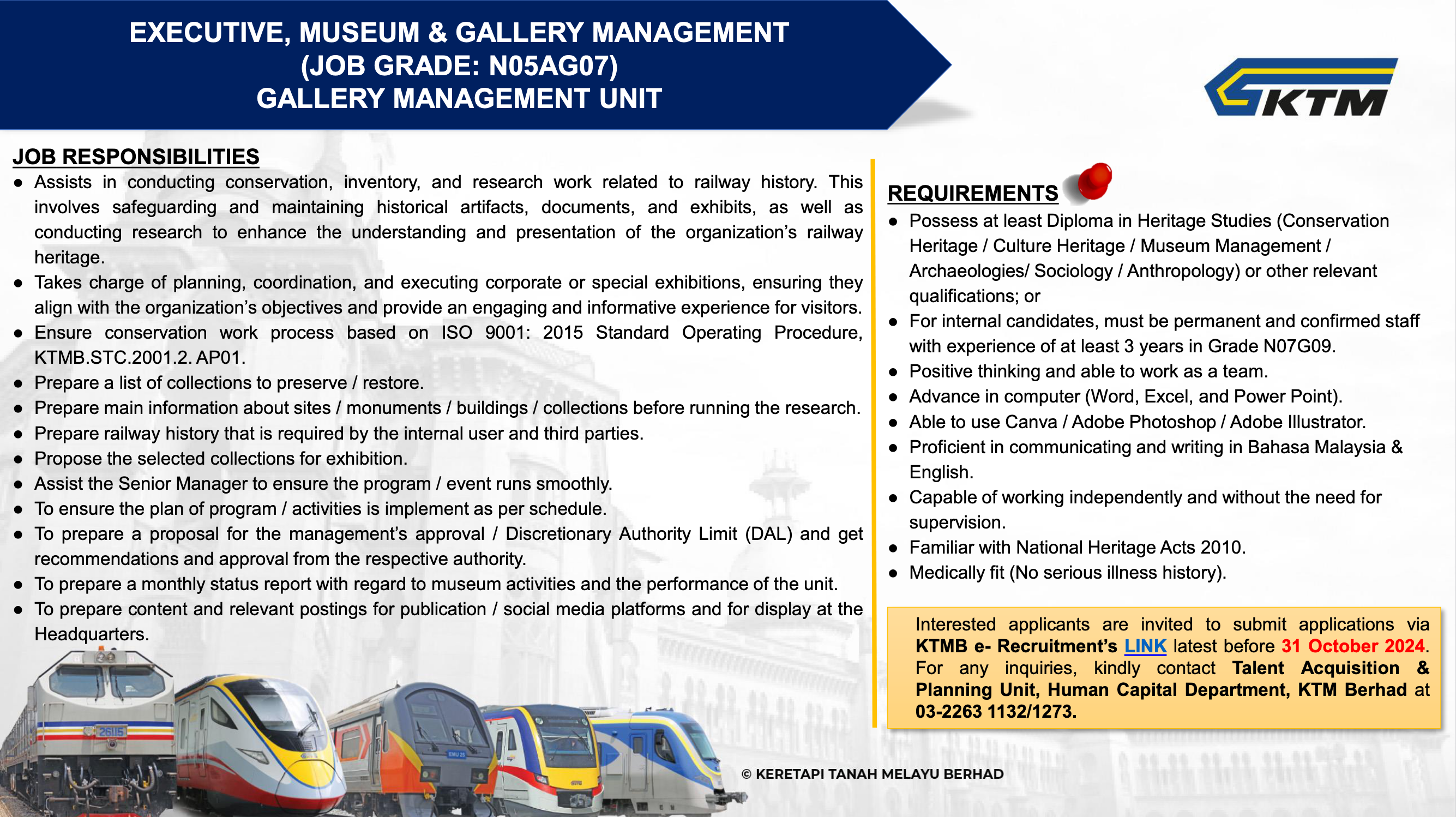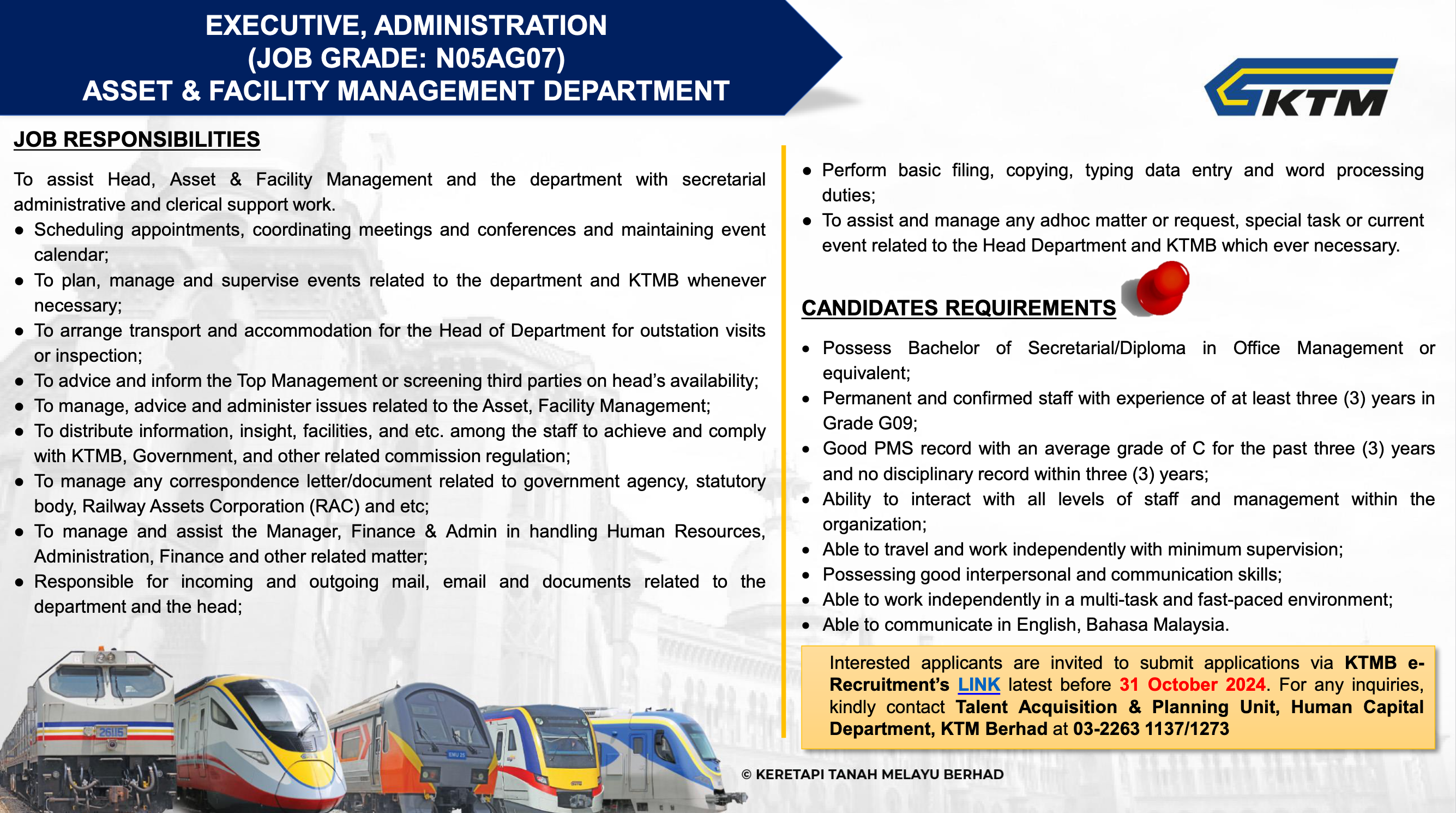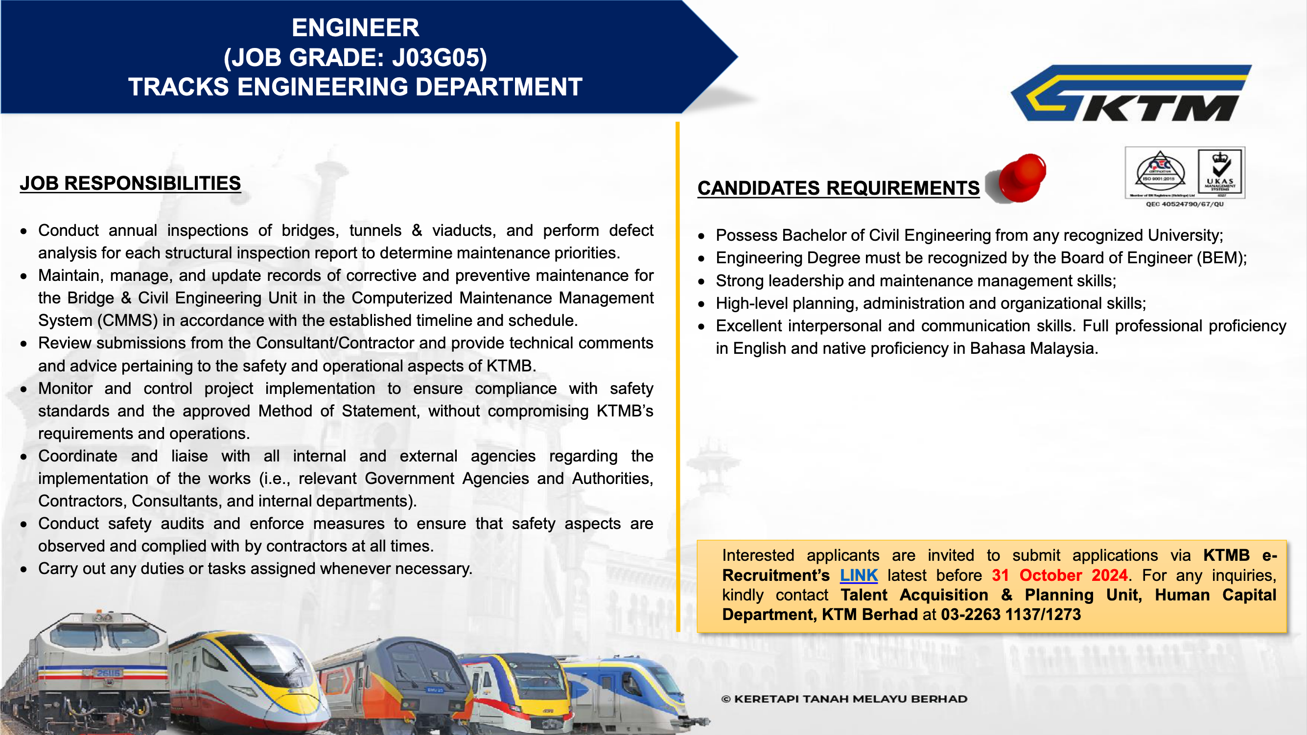 Iklan Kini Jawatan Kosong Keretapi Tanah Melayu Berhad (KTMB) Klik Jawatan Disini Like serta Ikut Facebook Kami, follow Chanel WhatsApp Jawatan Kosong & Telegram Portal SPA9 untuk capaian pantas kekosongan jawatan daripada kami sekarang.