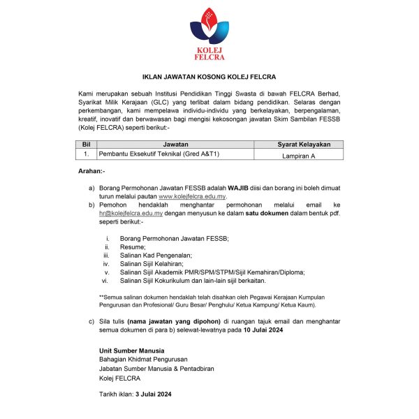 Iklan Kini Jawatan Kosong Kolej FELCRA Klik Jawatan Disini Like serta Ikut Facebook Kami, follow Chanel WhatsApp Jawatan Kosong & Telegram Portal SPA9 untuk capaian pantas kekosongan jawatan daripada kami sekarang.