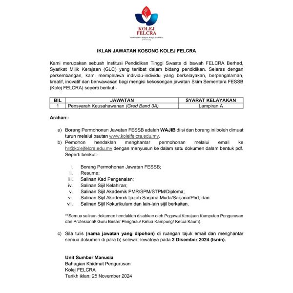 Iklan Kini Jawatan Kosong Kolej Felcra Klik Iklan Jawatan Like serta Ikut Facebook Kami, follow Chanel WhatsApp Jawatan Kosong & Telegram Portal SPA9 untuk capaian pantas kekosongan jawatan daripada kami sekarang.