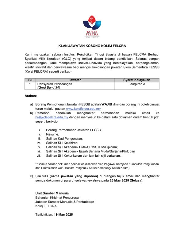 Iklan Kini Jawatan Kosong Kolej FELCRA (Bahagian Hal Ehwal Akademik) Like serta Ikut Facebook Kami, follow Chanel WhatsApp Jawatan Kosong & Telegram Portal SPA9 untuk capaian pantas kekosongan jawatan daripada kami sekarang. Klik Jawatan Disini