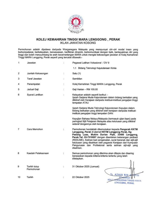 Iklan Kini Jawatan Kosong Kolej Kemahiran Tinggi Mara Lenggong Like serta Ikut Facebook Kami, follow Chanel WhatsApp Jawatan Kosong & Telegram Portal SPA9 untuk capaian pantas kekosongan jawatan daripada kami sekarang. Klik Iklan Jawatan