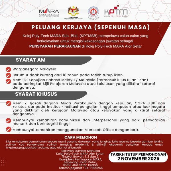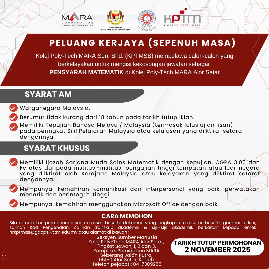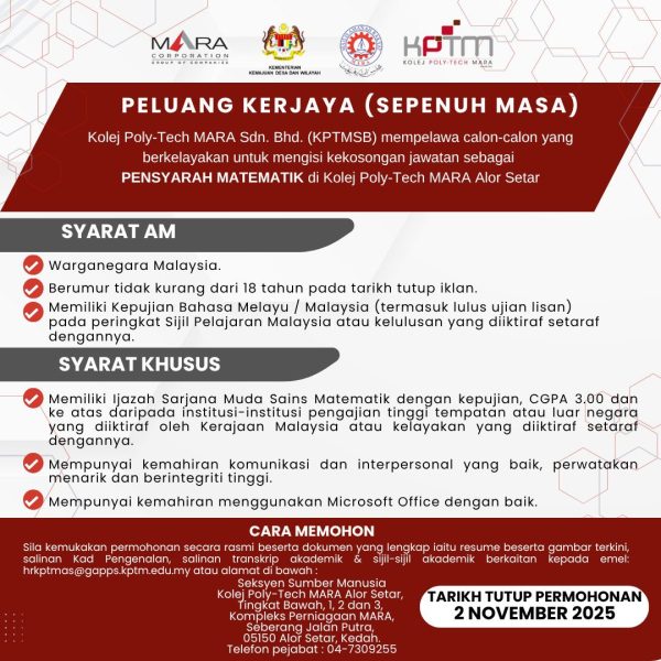 Iklan Kini Jawatan Kosong Kolej Poly-Tech MARA (KPTM) Klik Iklan Jawatan Like serta Ikut Facebook Kami, follow Chanel WhatsApp Jawatan Kosong & Telegram Portal SPA9 untuk capaian pantas kekosongan jawatan daripada kami sekarang.