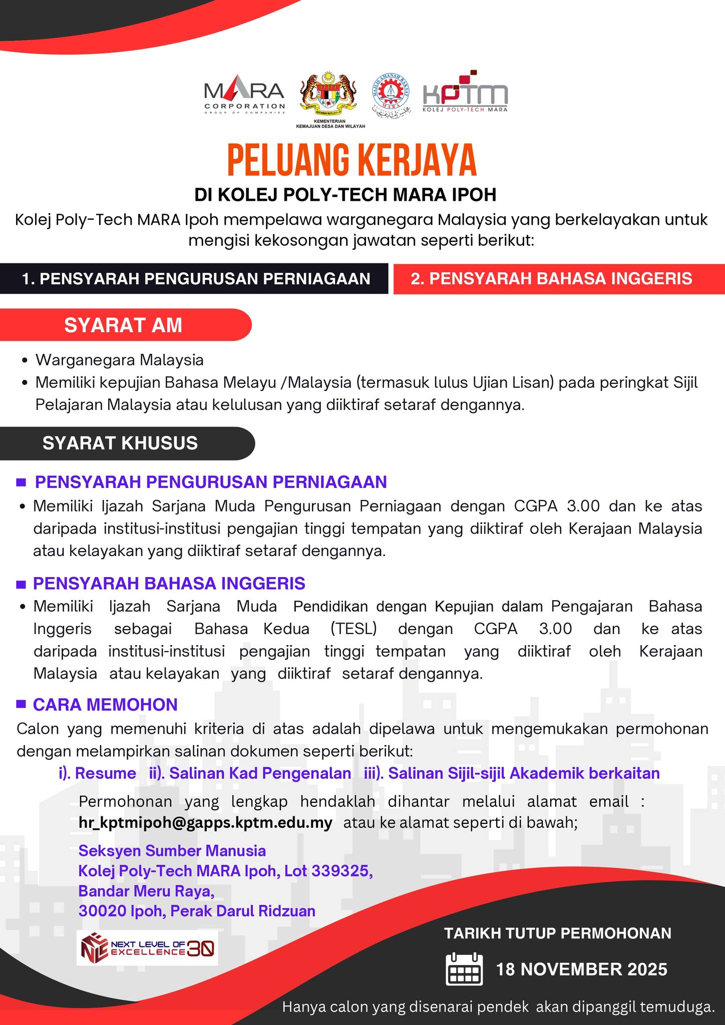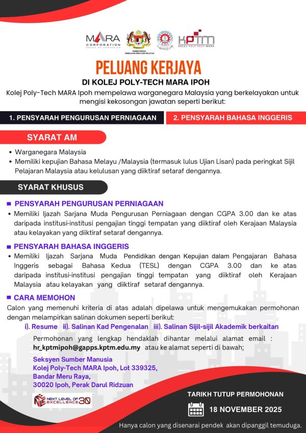 Iklan Kini Jawatan Kosong Kolej Poly-Tech MARA (KPTM) Like serta Ikut Facebook Kami, follow Chanel WhatsApp Jawatan Kosong & Telegram Portal SPA9 untuk capaian pantas kekosongan jawatan daripada kami sekarang. Klik Iklan Jawatan