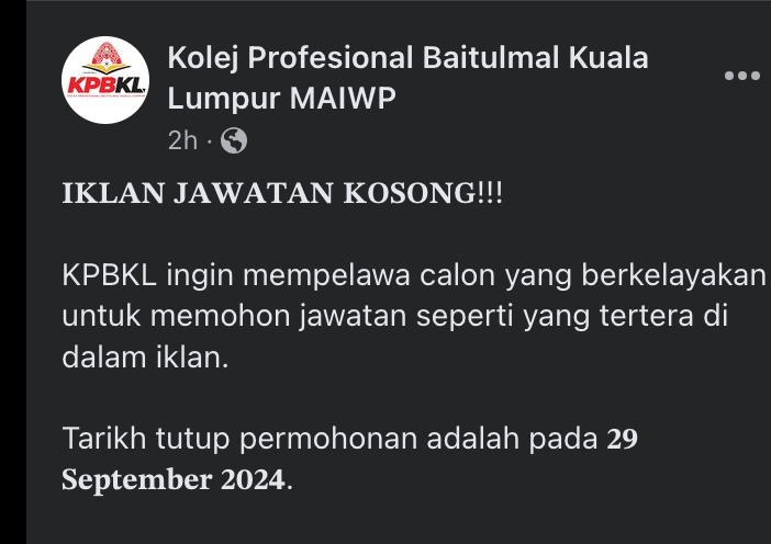 Iklan Kini Jawatan Kosong Kolej Profesional Baitulmal Kuala Lumpur (MAIWP) Like serta Ikut Facebook Kami, follow Chanel WhatsApp Jawatan Kosong & Telegram Portal SPA9 untuk capaian pantas kekosongan jawatan daripada kami sekarang.